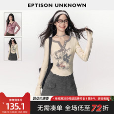 EPTISON长袖T恤女2025秋季新款修身短款甜辣复古印花V领设计上衣